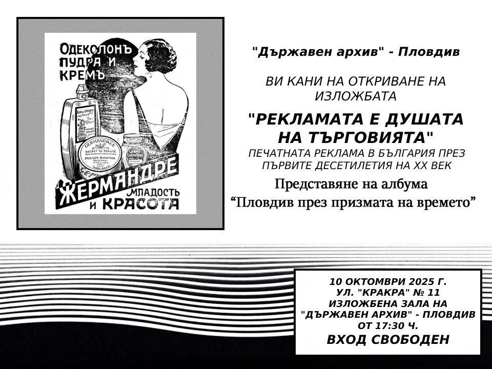 Държавен архив – Пловдив ни кани на откриването на изложбата „Рекламата е душата на търговията“. Експозицията представя печатната реклама в България през първите десетилетия на ХХ век – време, когато образът и думите започват да се превръщат в мощен инструмент за търговия и култура.